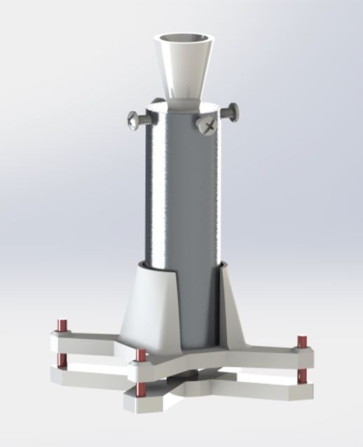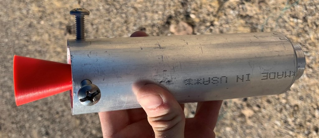 With the nozzle complete, the last piece of the combustion chamber was the bulkhead. Attaching and sealing the bulkhead became difficult due to the lack of a lathe. I was able to acquire an aluminum “plug” to fill out the bottom, but neither threads nor an o-ring groove could be machined. Both steel reinforced JB Weld and ExtremeHeat JB Weld were employed to resolve this issue. The ExtremeHeat JB Weld was placed internally at the bottom of the motor casing. It was rated up to 1300°C, which was about 200°C lower than the combustion temperatures. This was meant to act as an ablative barrier for the steel reinforced JB Weld which was applied externally to attach the aluminum plug to the casing. The tensile strength was rated up to 3900 psi, making it strong enough to withstand the axial stress. The main uncertainly was the adhesive strength. The value was not listed on the data sheet, but a similar product was rated up to 2400 psi. Because of this, it was expected that the JB Weld would yield for the 800 psi KNSU propellant. A 300 psi nozzle was designed to lower the expected force output. A bolt was also impregnated through the wall into the aluminum plug to prevent it from being pushed out.