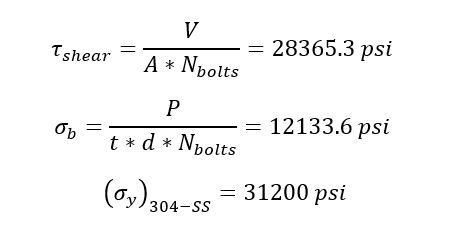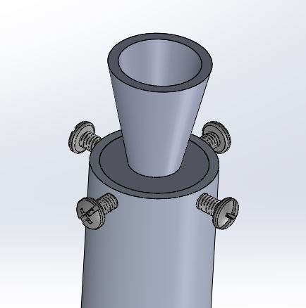 An o-ring groove was added so that a silicone o-ring could prevent gases from escaping through any potential voids between the nozzle and motor casing. Because I lacked access to a lathe, neither external nor internal threads could be created which would hold the nozzle inside the casing. Instead, I opted for dowel pin holes. Four holes were drilled through the motor casing which aligned with the holes shown in the nozzle. Stainless steel screws were inserted to act as dowel pins, holding the nozzle in place. Shear and bearing stress calculations were performed to ensure the neither the bolt nor aluminum underwent yielding.