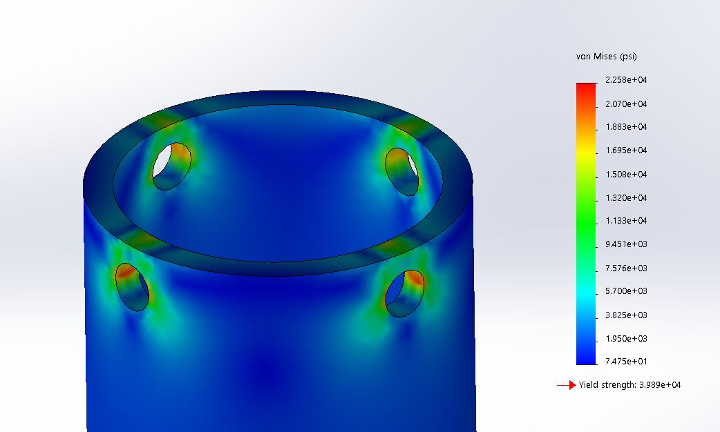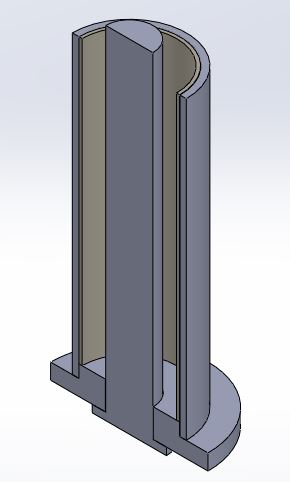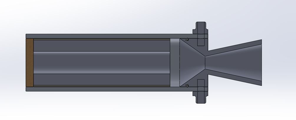 Once the grain size and nozzle geometry had been determined, it was time to develop a thrust chamber capable of withstanding the internal pressure and temperature produced in the combustion process. 6061-T6 Aluminum was selected for its common use in this application. Typically, a phenolic liner is employed to limit heat transfer to the combustion chamber walls, however, a cardboard liner was chosen instead due to cost and time constraints. Axial and hoop stresses were evaluated to determine at what pressures the material would yield.