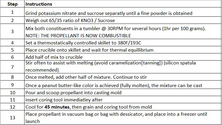 Due to lack of machining capabilities and a strong desire to meet the design constraints, the molds for the propellant were made from 3D printed PLA. The main con to using PLA over smooth metal for casting materials is that the propellant tends to get very stuck to the coring tool. Drilling was required to remove the tool everytime, which is not ideal as the grain can be damaged. Periodically, cavities appeared within the grain, likely due to improper packing, vibrations from drilling, and lack of constant pressure. The method used to prepare and cook the propellant is shown below in the table.