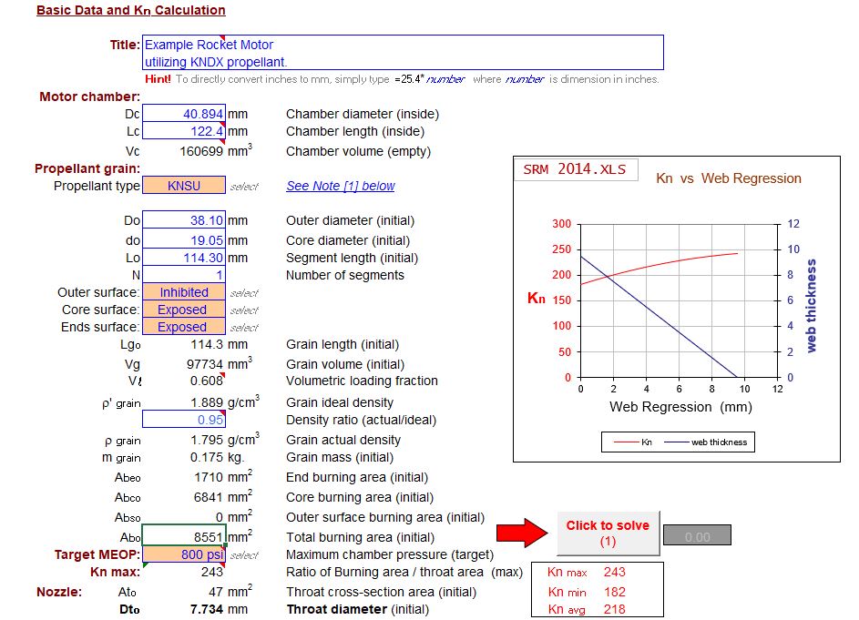 The COVID-19 pandemic forced many people to work from home. During this time, I thought it would be fun to create some potassium nitrate (KNO3) and sucrose (C12H22O11) propellant, abbreviated as KNSU. I started this project by diving into solid rocket motor theory, which can conveniently be found on Richard Nakka’s webpage (http://www.nakka-rocketry.net/articles/nakka_theory_pages.pdf). Nakka has an excel spreadsheet on his website which assists with KNSU propellant design. Using knowledge obtained from theory in conjunction with the spreadsheet, I was able to create a valid design for small scale propulsion test with a chamber pressure of 800 psi.