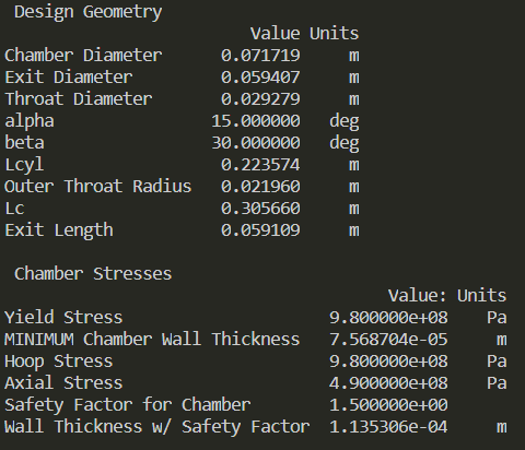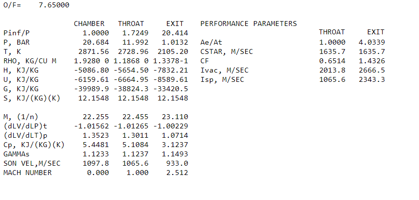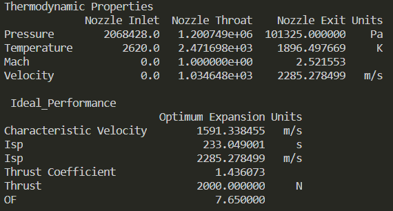 Once the optimal O/F ratio and chamber pressure was determined, CEA was again utilized to find other useful parameters required for calculating performance. The results at 300 psi are shown below.