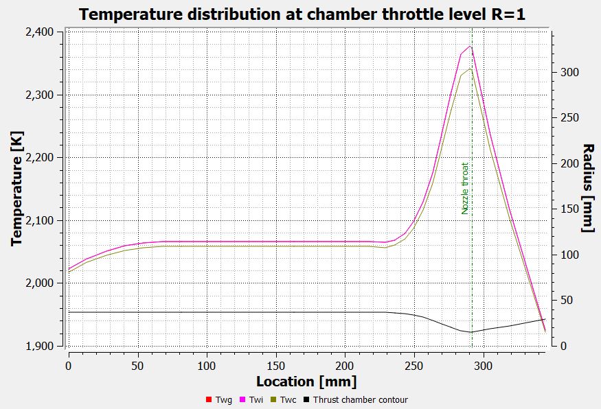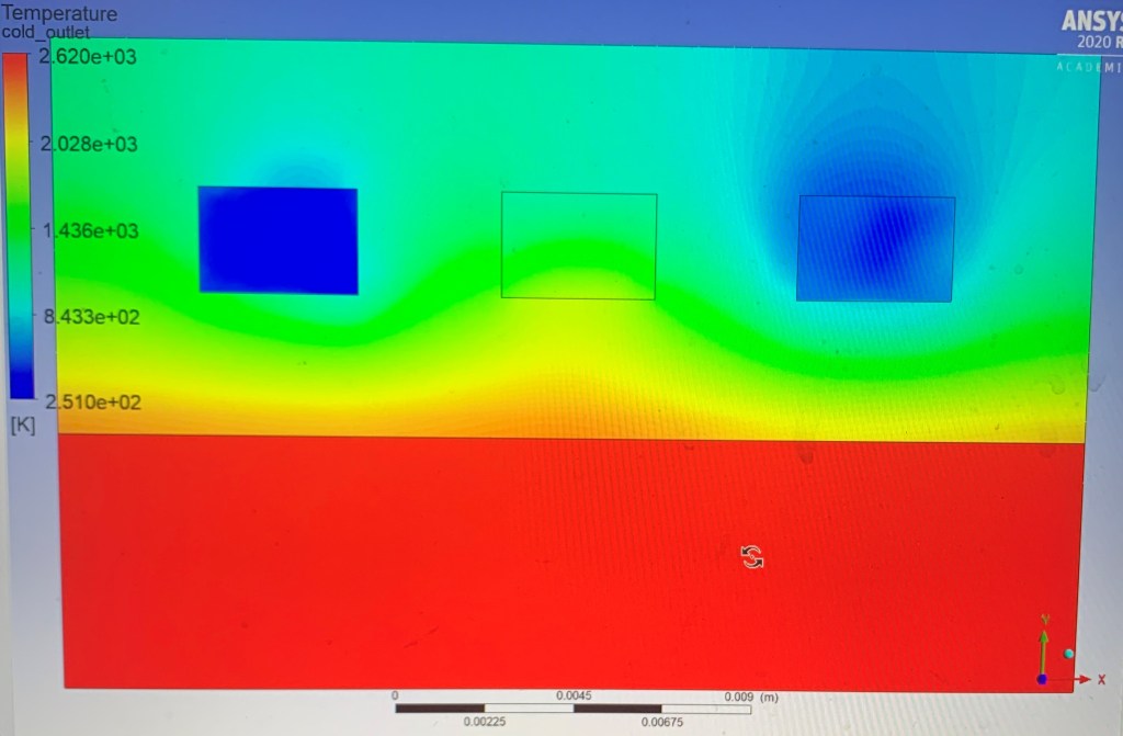 Using RPA, I began evaluating the expected wall temperature, shown below. From this analysis, the anticipated wall temperature is nearly 2,400 Kelvin. The nozzle/chamber will likely be additively manufactured from Inconel 718 or a GRCop Alloy. Additionally, a regenerative cooling system will be implemented to assist with cooling. I am actively carrying out 2D and 3D simulations in ANSYS to determine the required coolant velocity and channel sizes.