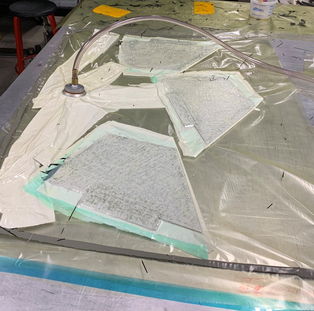 Following the completion of the lower propulsion system, fin fabrication came next. Being that it was our first year with a large rocket, we encountered some unique design hurdles that needed to be overcome. For this project, we decided to enhance our fin fabrication techniques, which led us to the realm of composites. Because computer numerical control machines (CNC) were largely unavailable to make make molds, my teammate Nick Chai and I opted to wrap carbon fiber (CF) composite material over 3D printed ABS fins, something that had never been performed before at our school. The fins themselves utilized a symmetric airfoil design and included a rectangular piece on the bottom used for slotting the fin inside the body. Internal cylindrical passages were printed within the fin and rectangular piece which carbon rods were inserted into. This was used to connect the two pieces. Two plies of [0/90] CF were applied to the exterior of the 3D printed fins. Resin was manually measured and applied to each layer of the CF. We chose to use the vacuum bag technique to remove excess resin from the layup.