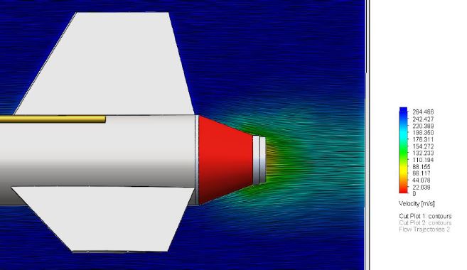 Further modifications were made to the thrust plate to help with mass reduction. To ensure the thrust plate and aluminum tube were able to withstand the load, both hand calculations and finite element analysis (FEA) were performed. SolidWorks provides both the capability to perform FEA as well as computational fluid dynamics (CFD) with reasonable accuracy. In addition to verifying the strength of this design, CFD was performed on the boattail to observe the effects with and without it.