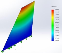 The fins were printed on a FORTUS 250mc with the lowest infill density parameter selected. Because of the infill settings and composite material, analysis was difficult. To overcome the complexities of composite analysis, it was decided that the fins would be modeled as solid ABS structures and analyzed in that manner, the logic being that CF is considerably stronger than ABS. CFD was performed to gain an understanding of flow patterns on symmetric airfoils. Furthermore, the pressure data gathered from the flow study was exported to FEA to determine if the fins would yield. From this analysis, it was found that minimal displacement would occur and that the fins would not yield. AeroFinSim was also employed to determine fin flutter velocity, which was expected to occur at 1977 ft/s. This was over double the max velocity of the rocket, ensuring the fins would not flutter.