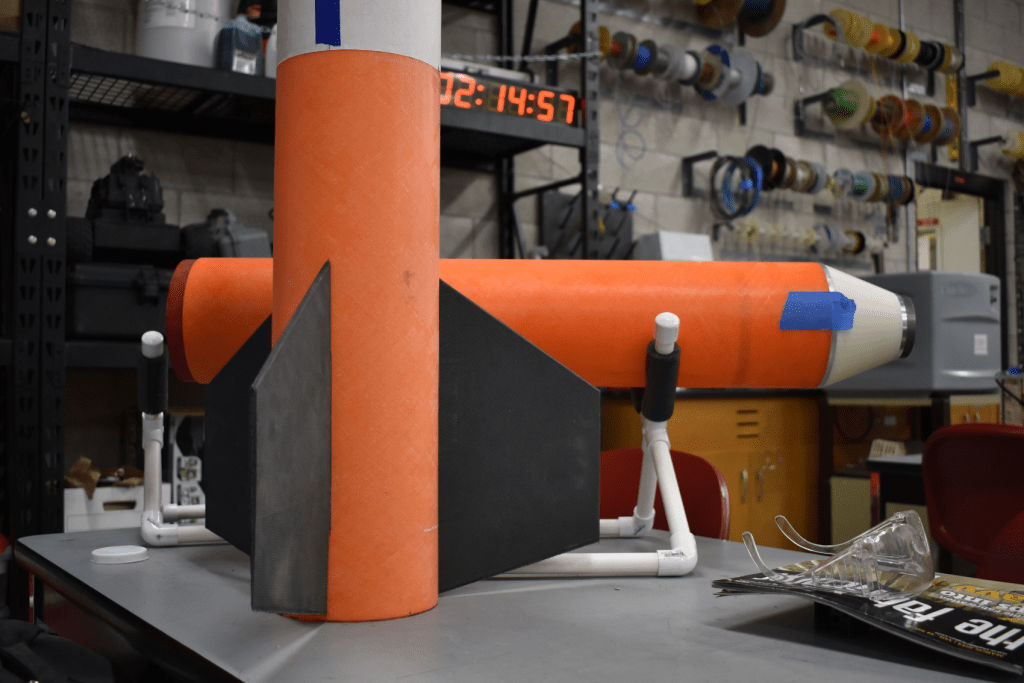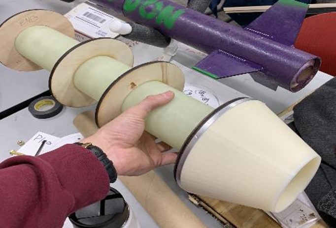 I took the role of lead propulsion and airframe designer. This role largely consisted of designing the rocket, running flight and structural simulations, and fabrication of rocket components. For this competition, I utilized a paid software called RockSim to assist in the design of the rocket. The final designed produced a 6.15 ft tall, 6.2 in diameter rocket named “The Loveship.”