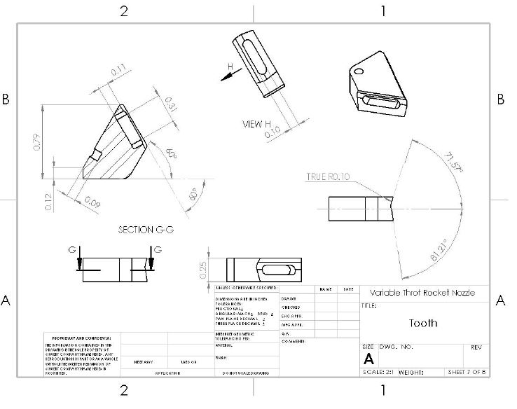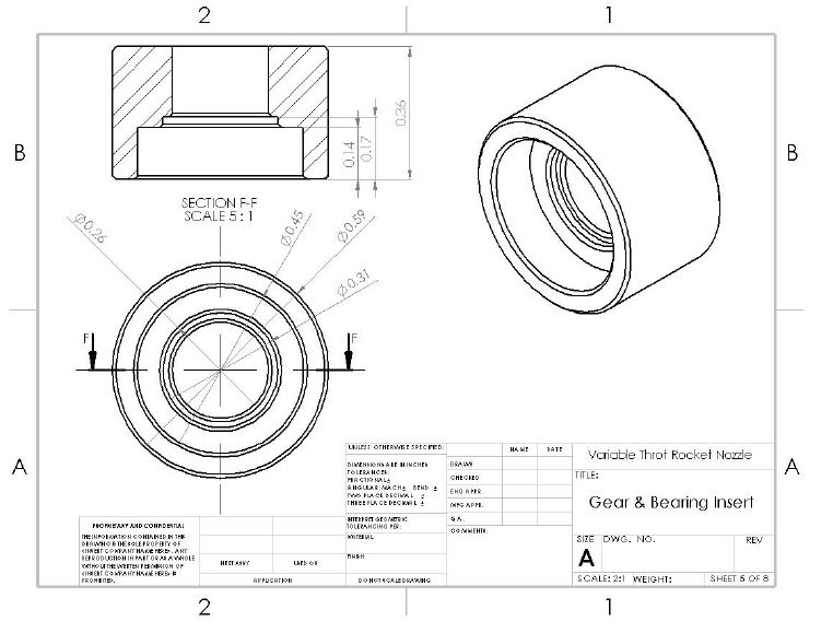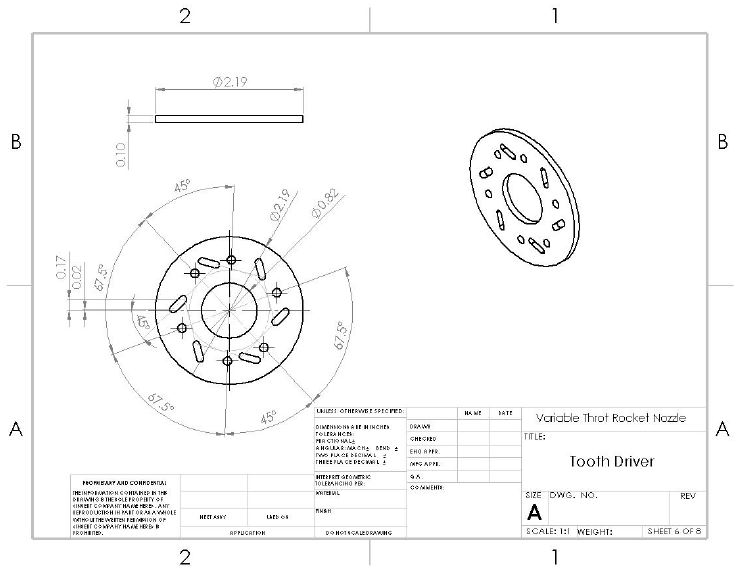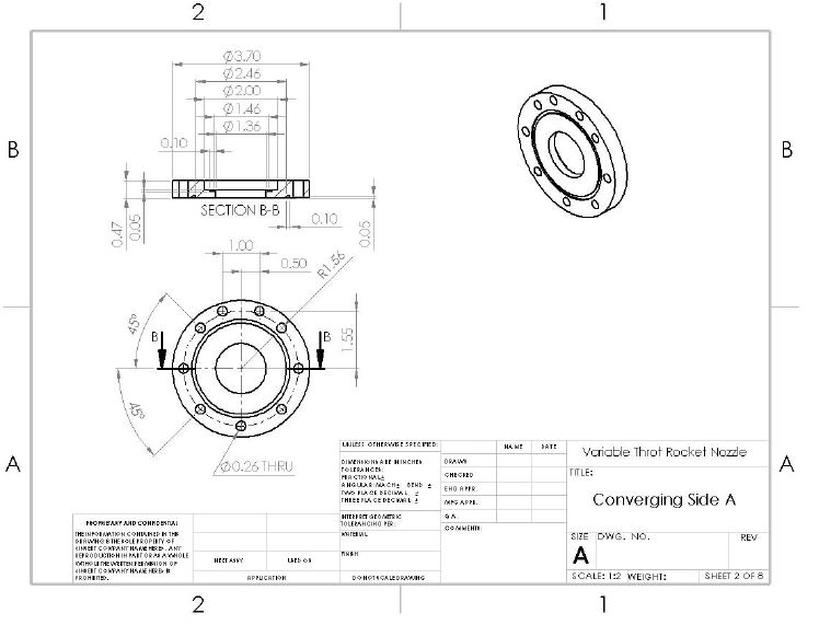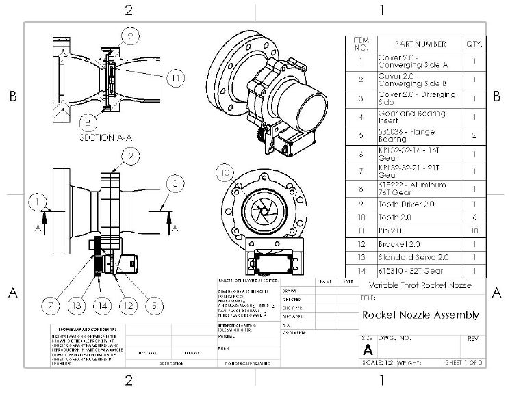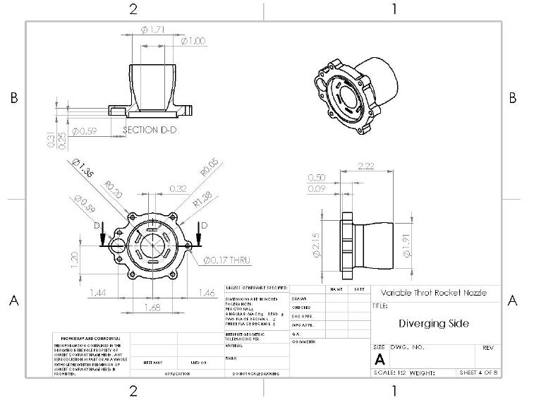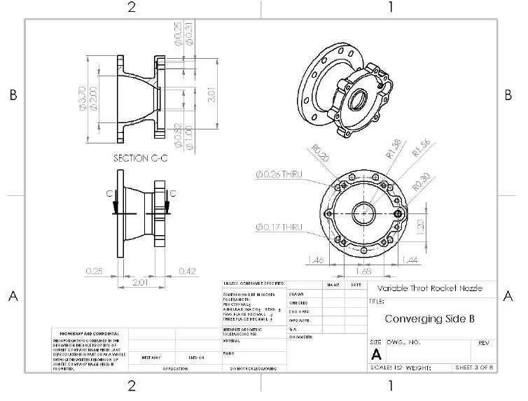 Once the optimal nozzle contours had been determined, the iris design was merged with it. Several o-rings and gaskets were incorporated where possible to prevent combustion gases from leaking. The final drawings can be seen below.