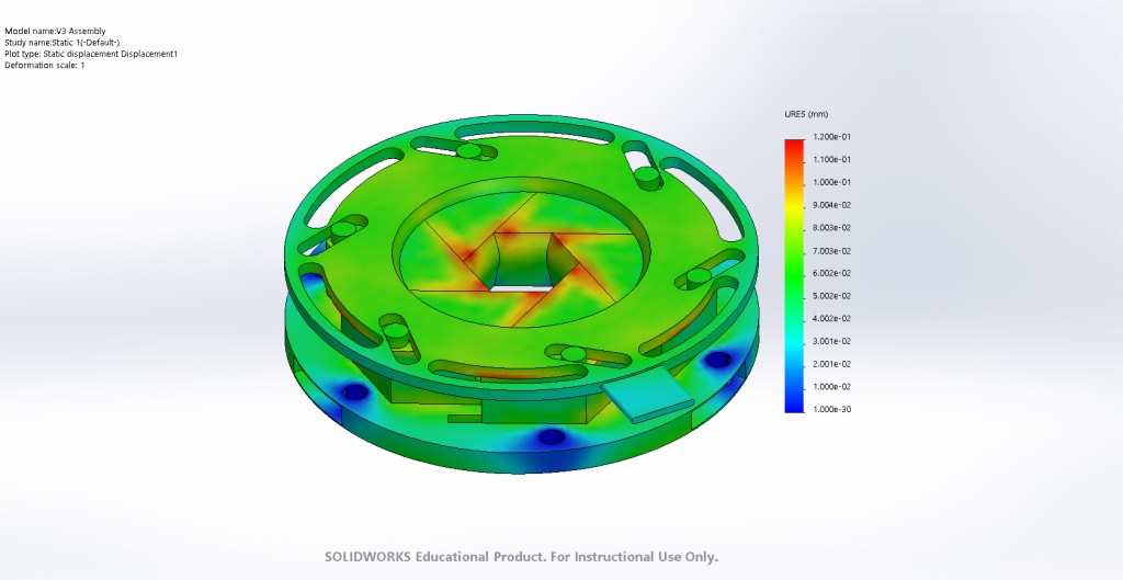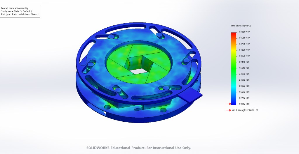 From the analysis, it became apparent that the iris would undergo yielding should a steady-state temperature of 2273 Kelvin be reached. To practically offset this, the motor was run in short burst to ensure steady-state values would not be achieved.