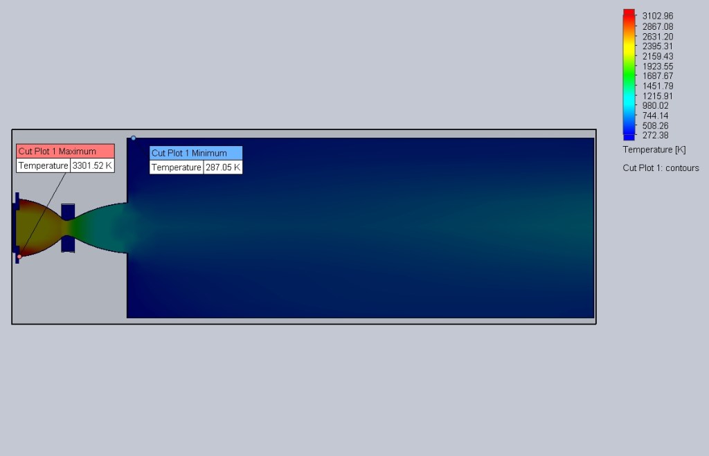 The analysis showed that a variation in outlet Mach number was achieved. The Mach values at the exit had about a 10% difference when compared to the theoretical values. As such, we knew this wasn’t going to be extremely accurate, but it proved the concept. Temperature values at the throat and exit very nearly matched the theoretical values, increasing trust in the analysis, but the pressure was drastically different.