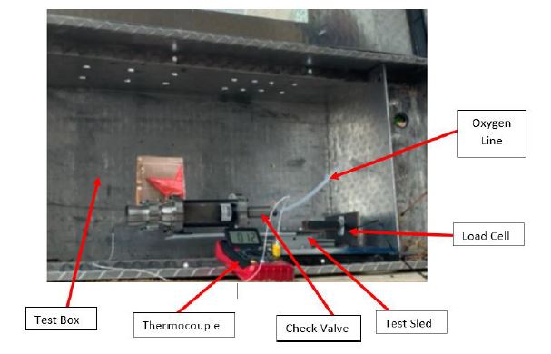 An old test sled for testing small estes motors was modified to fit our needs. An image of the setup can be seen below. An oxygen tank sat a sufficient distance away with a pressure regulator rated for 0 – 120 psi. A steel check valve was connected to the system and acted as the injector for this setup. A disk-type load cell rated for 80 kg was utilized to gather thrust data. A K-type thermocouple was placed at the exit of the nozzle to compare theoretical and computationally determined values.