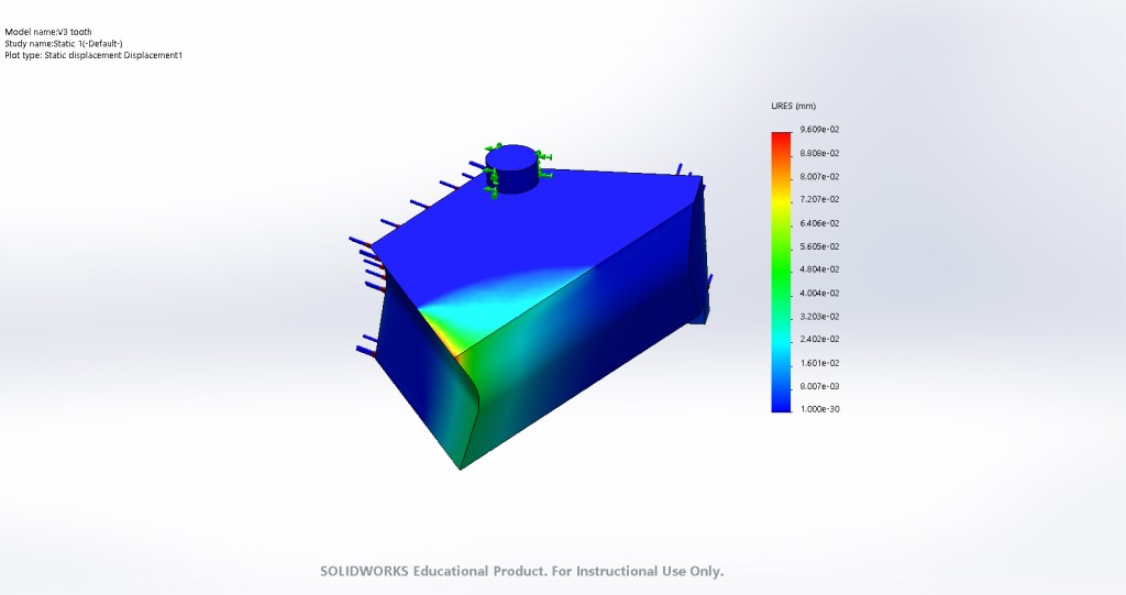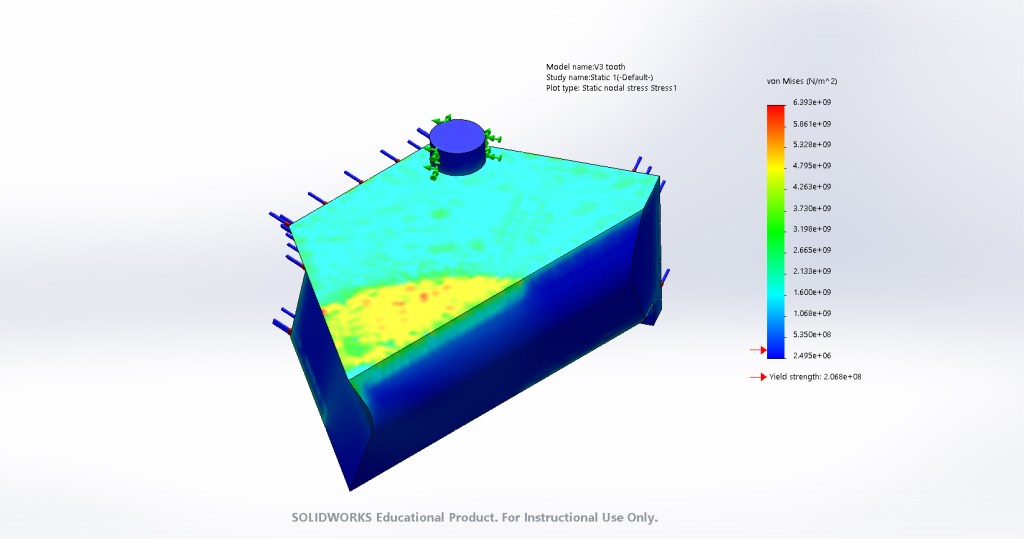 The pressure data gathered from the simulation was then imported into SolidWorks FEA. Two different methods were investigated here. In the first, the entire assembly was analyzed. In the second, a split line was drawn across a single tooth and theoretical steady-state temperature and pressures were applied.